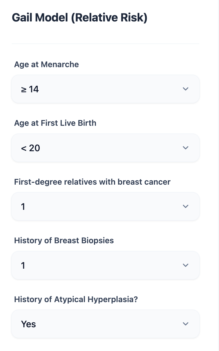 Estimate 5-year and lifetime breast cancer risk with the Gail Model (Relative Risk) and get treatment-oriented interpretation in seconds using the OncoToolkit calculator.