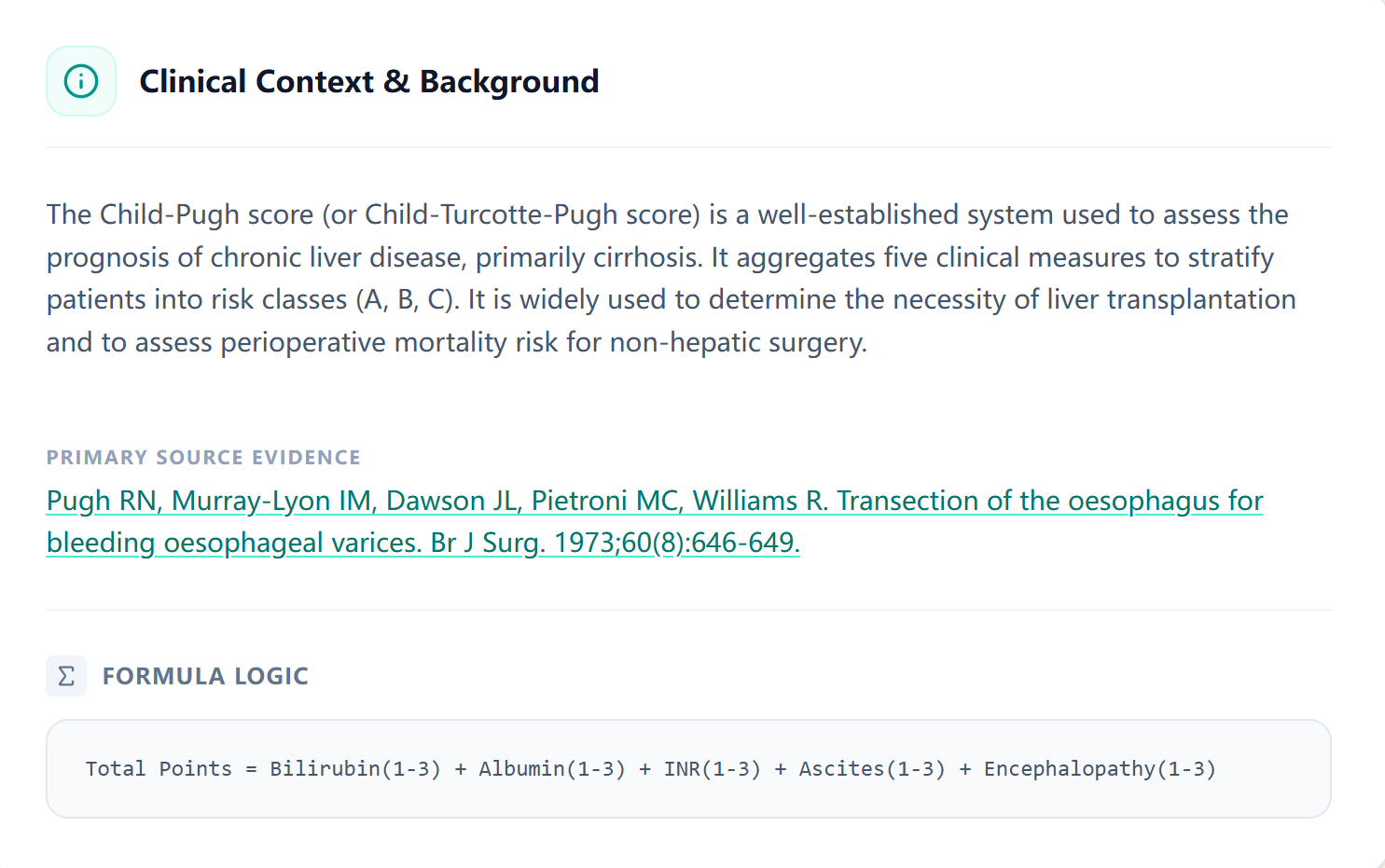 This transparency is especially valuable for teaching. When a fellow enters values and immediately sees the 5-point breakdown alongside clinical interpretation, the scoring logic becomes intuitive—strengthening understanding of hepatic reserve, portal hypertension severity, and prognosis.
