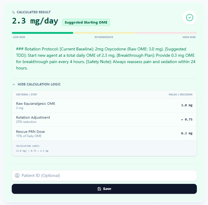 - Calculate and review: Generate the standardized OME and starting regimen in one click [9], [6].
