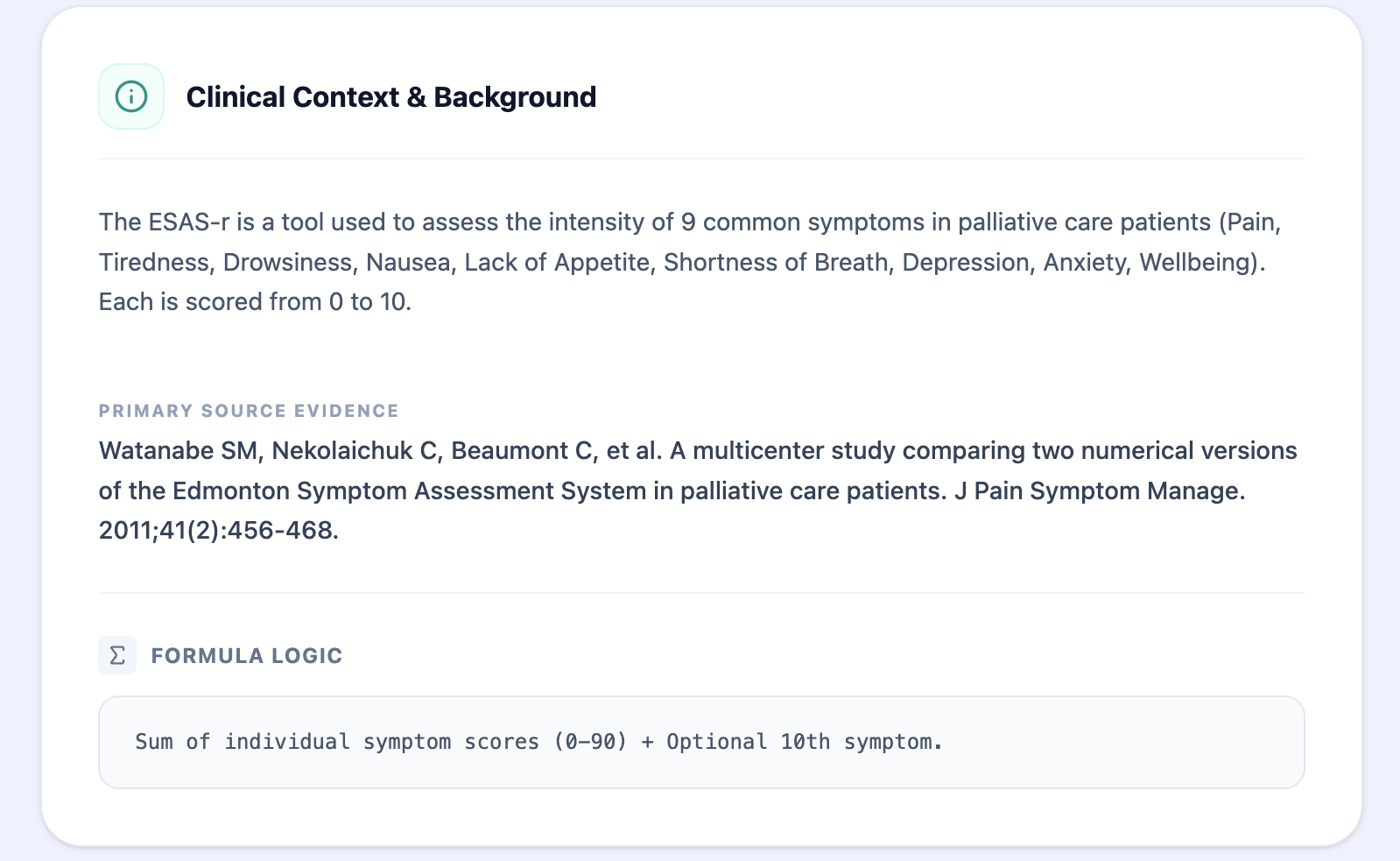 The Edmonton Symptom Assessment System-Revised (ESAS-r) addresses this critical need by providing a validated, rapid screening tool. At OncoToolkit, we've built a digital ESAS-r calculator that transforms this evidence-based framework into an efficient, mobile-responsive clinical decision support tool designed specifically for the realities of modern pain medicine and oncology practice [4], [5].